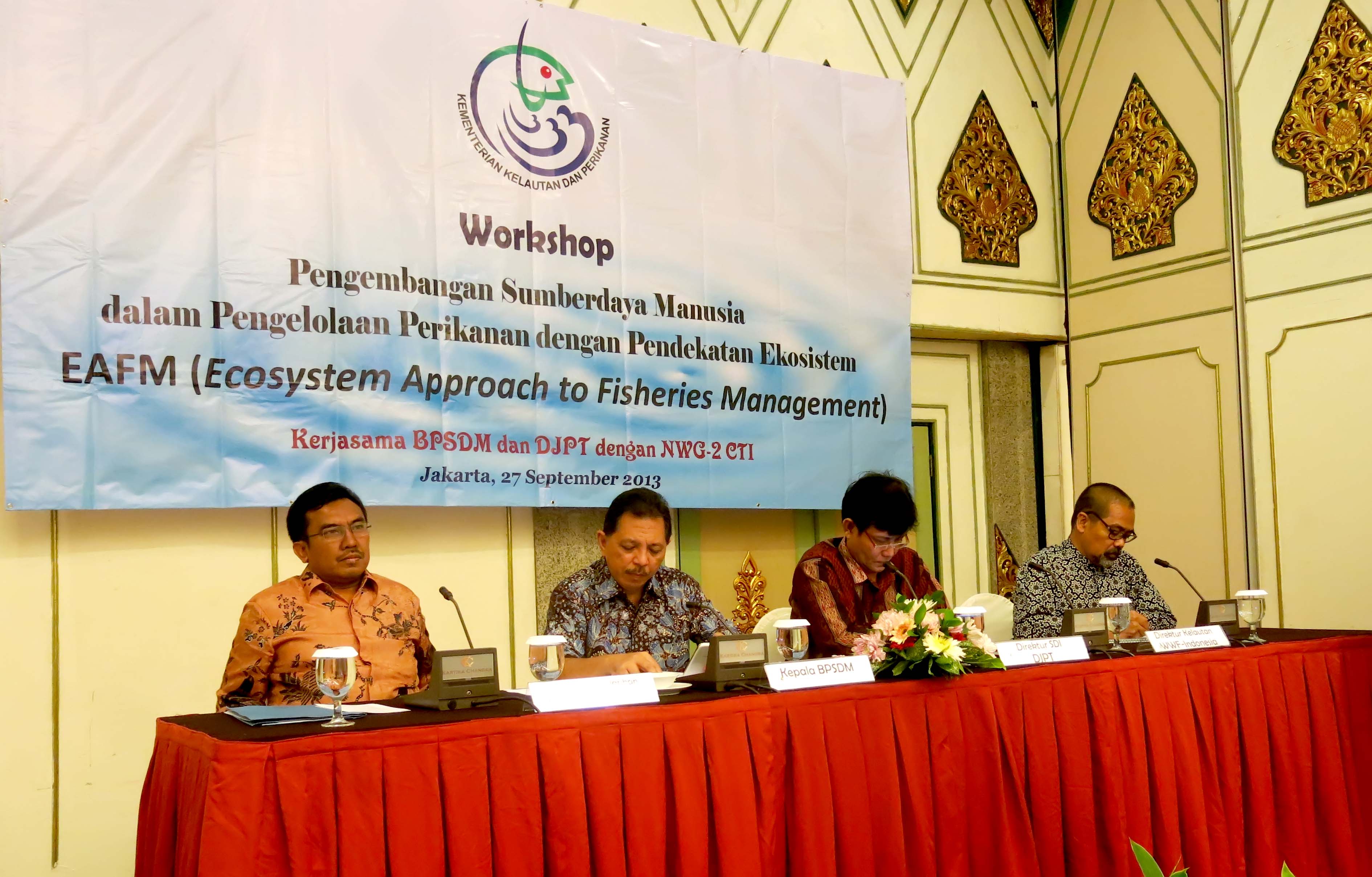 Selama ini pengelolaan dan praktek perikanan di Indonesia masih terfokus pada jumlah tangkapan, belum memperhatikan keseimbangan ekosistem. Wawan Ridwan, Direktur Program Kelautan dan Perikanan WWF-Indonesia, mengatakan, “Dampaknya lebih banyak yang negatif, yaitu kerusakan terumbu karang dan ekosistem dasar laut dan terjadinya penangkapan berlebihan atau overfishing.” Beliau mengatakan hal tersebut dalam acara Lokakarya Pengembangan Sumber Daya Manusia dalam Pengelolaan Perikanan dengan Pendekatan Ekosistem – EAFM yang digelar kemarin (27/9) di Hotel Kartika Chandra, Jakarta. Lokakarya ini terselenggara atas hasil kerja sama Badan Pengembangan Sumber Daya Manusia (BPSDM), Direktorat Jenderal Perikanan Tangkap (DJPT) dan National Working Group-2 Coral Triangle Initiative (NWG-2 CTI).